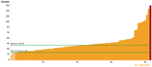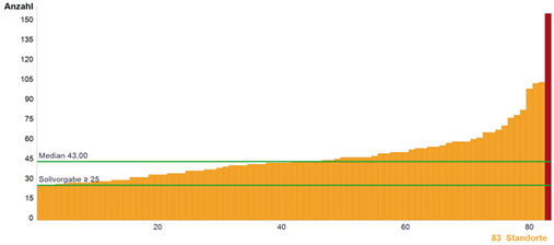 Das interdisziplinäre Pankreaskarzinomzentrum am St. Josef-Hospital Bochum gehört zu den 91 von der Deutschen Krebsgesellschaft zertifizierten Zentren. Mit 155 Primärfällen bringt unser Zentrum die meisten Patienten mit dieser Diagnose ein und die Behandlungsergebnisse gehören im Vergleich zu den anderen Zentren zu den Besten. Nachfolgend sind ein paar Vergleichsergebnisse gezeigt (unser Pankreaskarzinomzentrum ist jeweils mit dem roten Balken dargestellt).