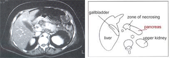 At left: picture of a computerised tomography (CAT Scan) of a distinct homogenic enlargement of the pancreas with a oedematous pancreatitiss; at right: diagrammic presentation