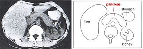 Normal pancreas: at left: picture of a computerised tomography (CAT Scan) with normal healthy organs; at right: diagrammic presentation