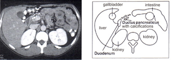 Picture of a computerised tomography (CAT Scan) or a sketch show a enlarged pancreatic duct in the body of the pancreas, with calcination.