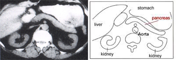 Normal pancreas: at left: picture of a computerised tomography (CAT Scan) with normal healthy organs; at right: diagrammic presentation