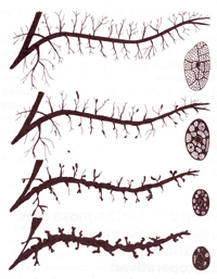 Main duct of the pancreas. ERCP-pictures that show different stages of a chronic pancreatitis, increasing from top to bottom.
