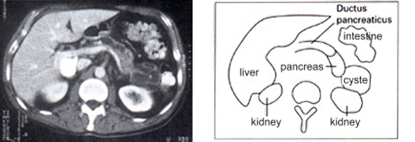 This picture of a computerised tomography (CAT Scan) or the sketch show a cyste at the tail of the pancreas.
