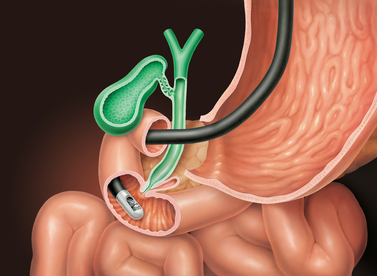 ERCP allows a precise examination of the bile ducts and pancreas to be carried out. This is a highly important supplementary test to the other image-producing tests. In the course of ERCP, other procedures can be carried out, such as the removal of a gall stone, which could block the bile duct or the pancreatic duct.