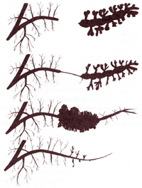 Ganz ähnlich verläuft das Krebsleiden auch, wenn der Tumor nicht vom Pankreasgewebe selbst sondern vom tief sitzenden Gallengang (der durch den Bauchspeicheldrüsenkopf hindurchzieht) oder der Papille, dem Ausführungsgang des Bauchspeichels und der Gallenflüssigkeit in den Zwölffingerdarm, ausgeht. Diese Formen haben den Vorteil, dass sie durch den frühzeitigen Ikterus (Gelbsucht) bald erkannt werden können.